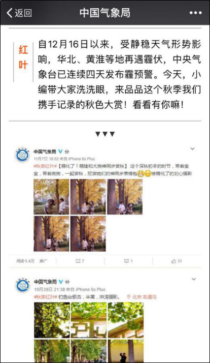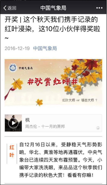 12月19日,气象局官方微信“我国气象局”发布“开奖 这个秋天咱们携手记载的红叶浸染,这10位小伙伴得奖啦~”,联合微博渠道展现网友参加的活动效果。