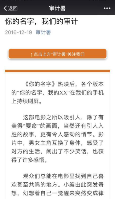12月19日,审计署官方微信“审计署”推送“你的姓名,咱们的审计”,结合热映的电影《你的姓名》,与下辖机关联动发声,一起展现实在的审计工作场景。