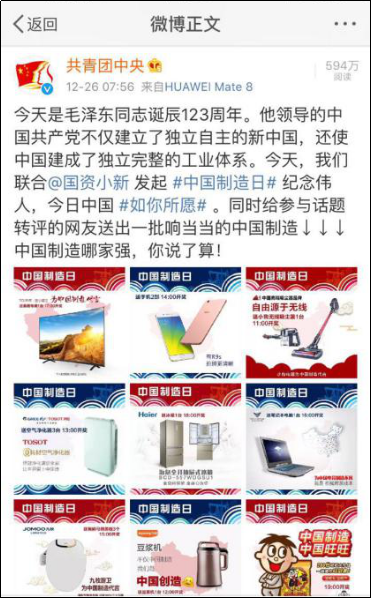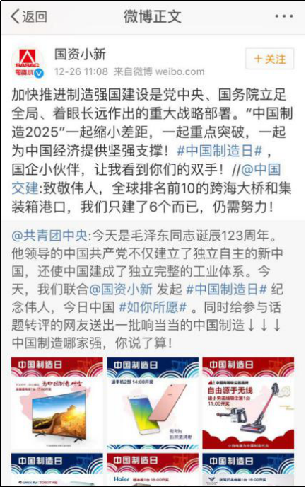 12月26日,共青团中心官方微博“共青团中心”与国资委官方微博“国资小新”,一起举行“ #我国制作日# 留念巨人,今天我国 #如你所愿# ”转发抽奖活动,为我国制作加油、鼓劲,取得社会各界的广泛重视,当天下午“#我国制作日#”这一话题词即登上了微博热门话题榜。